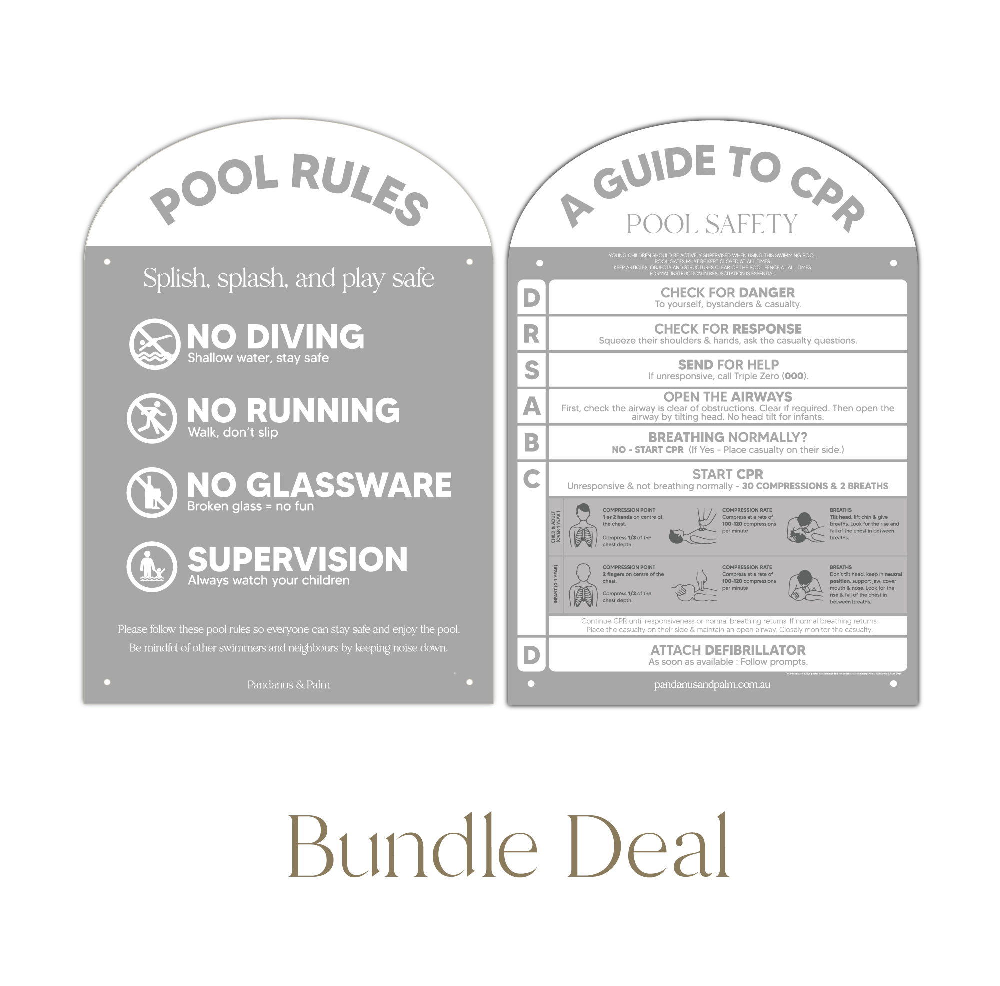 Pool CPR Safety Sign + Pool Rules Bundle | Arch | Grey