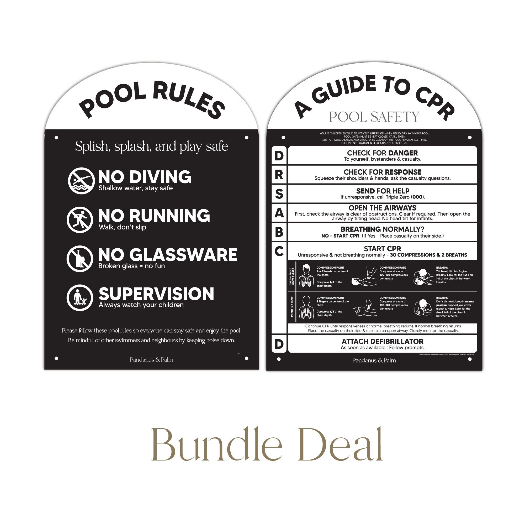 Pool CPR Safety Sign + Pool Rules Bundle | Arch | Black